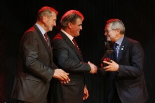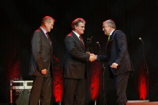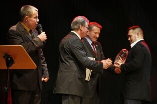 Gdańska Gala Sportu, podczas której nagrodzono wybitnych sportowców za ich osiągnięcia. Gdańsk, Filharmonia Bałtycka. Nz. nagroda w kategorii "Sportowa Impreza Roku 2011" za organizację meczu piłki nożnej Polska-Niemcy. Nagrodę odbiera W-ce Prezes PZPN Adam Olkowicz, którą wręczają Przewodniczący Rady Miasta Gdańska Bogdan Oleszek i Przewodniczący Gdańskiej Rady Sportu Wojciech Przybylski