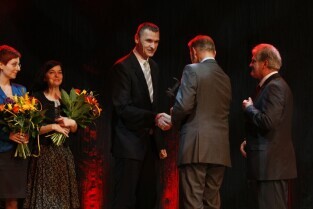 Gdańska Gala Sportu, podczas której nagrodzono wybitnych sportowców za ich osiągnięcia. Gdańsk, Filharmonia Bałtycka. Nz. nagroda "Sportowiec Roku 2011" - Daria Pogorzelec (odbiera trener Tomasz Lisicki), którą wręczyli Przewodniczący Rady Miasta Gdańska Bogdan Oleszek i Przewodniczący Gdańskiej Rady Sportu Wojciech Przybylski