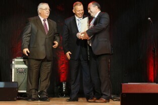 Gdańska Gala Sportu, podczas której nagrodzono wybitnych sportowców za ich osiągnięcia. Gdańsk, Filharmonia Bałtycka. Nz. "Nagroda Specjalna Roku 2011" dla Społecznego Komitetu Wsparcia EURO 2012 (odbiera Przewodniczący Piotr Soyka), którą wręczają Przewodniczący Rady Miasta Gdańska Bogdan Oleszek i Przewodniczący Gdańskiej Rady Sportu Wojciech Przybylski