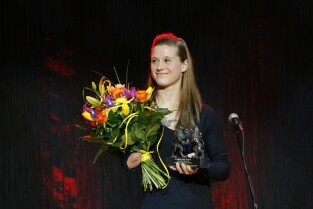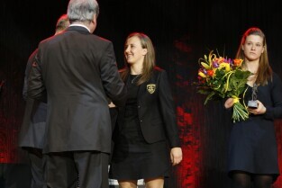 Gdańska Gala Sportu, podczas której nagrodzono wybitnych sportowców za ich osiągnięcia. Gdańsk, Filharmonia Bałtycka. Nz. nagroda "Sportowiec Roku 2011" - Karolina Jaszczyszyn, którą wręczyli Przewodniczący Rady Miasta Gdańska Bogdan Oleszek i Przewodniczący Gdańskiej Rady Sportu Wojciech Przybylski