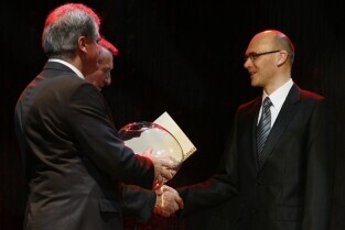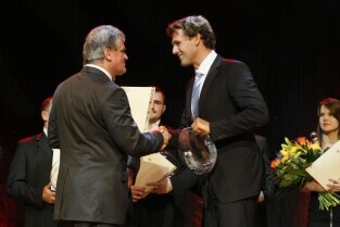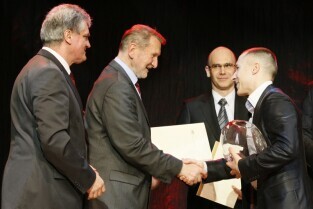 Gdańska Gala Sportu, podczas której nagrodzono wybitnych sportowców za ich osiągnięcia. Gdańsk, Filharmonia Bałtycka. Nz. nagroda "Sportowiec Roku 2011" - Piotr Jurkowski, którą wręczyli Przewodniczący Rady Miasta Gdańska Bogdan Oleszek i Przewodniczący Gdańskiej Rady Sportu Wojciech Przybylski