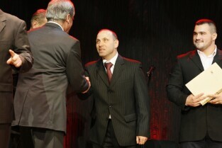 Gdańska Gala Sportu, podczas której nagrodzono wybitnych sportowców za ich osiągnięcia. Gdańsk, Filharmonia Bałtycka. Nz. laureat pierwszej nagrody "Sportowiec Roku 2011" Piotr Myszka, którą wręczyli Przewodniczący Rady Miasta Gdańska Bogdan Oleszek i Przewodniczący Gdańskiej Rady Sportu Wojciech Przybylski