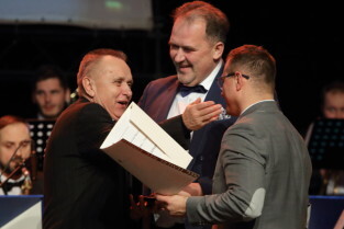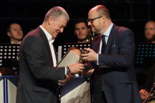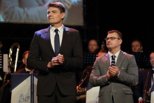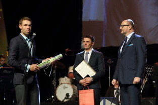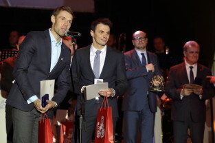Gdańsk, Hala Widowiskowo-Sportowa AWFiS. Gdańska Gala Sportu. Najlepsi sportowcy 2017 roku nagrodzeni. Nz. Żeglarze: Paweł Koodziejski i Łukasz Przybyłek.