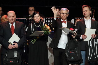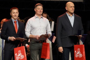 Gdańsk, Hala Widowiskowo-Sportowa AWFiS. Gdańska Gala Sportu. Najlepsi sportowcy 2017 roku nagrodzeni. Nz. Żeglarze: Paweł Koodziejski, Łukasz Przybyłek i Prezydent Gdańsak Paweł Adamowicz