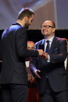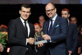 Gdańsk, Hala Widowiskowo-Sportowa AWFiS. Gdańska Gala Sportu. Najlepsi sportowcy 2017 roku nagrodzeni. Nz. Mateusz Biskup - wicemistrz świata i Europy w wioślarstwie i Prezydent Gdańska Paweł Adamowicz.