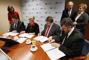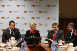 Podpisanie umowy na realizację projektu "Gdańskiej Platformy Edukacyjnej", w ramach którego powstaną m.in. e-sekretariaty i e-dzienniki . Gdańsk, Urząd Miejski. Nz. od lewej: Dyrektor Działu Handlowego Otago Sp. z o.o. Jakub Buczyło, Z-ca Prezydenta Gdańska Ewa Kamińska, Prezes Young Digital Planet S.A. Waldemar Kucharski