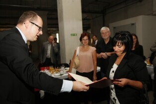 Stocznia Gdańska, Hala B90. Posiedzenie Gdańskiej Rady Kultury połączone ze zwiedzaniem wystawy w ramach festiwalu Alternativa. Nz. Prezydent Gdańska Paweł Adamowicz wręcza akt mianowania nowej członkini Gdańskiej Rady Kultury, który odbiera Bożena Olechnowicz