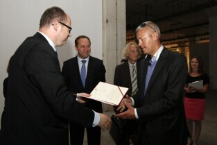 Stocznia Gdańska, Hala B90. Posiedzenie Gdańskiej Rady Kultury połączone ze zwiedzaniem wystawy w ramach festiwalu Alternativa. Nz. Prezydent Gdańska Paweł Adamowicz wręcza akt mianowania nowemu członkowi Gdańskiej Rady Kultury, który odbiera Michał Kaczorowski