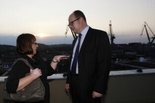 Stocznia Gdańska, Hala B90. Posiedzenie Gdańskiej Rady Kultury połączone ze zwiedzaniem wystawy w ramach festiwalu Alternativa. Nz. Dyrektor Biura Prezydenta Gdańska ds. Kultury Anna Czekanowicz-Drążewska i Prezydent Gdańska Paweł Adamowicz