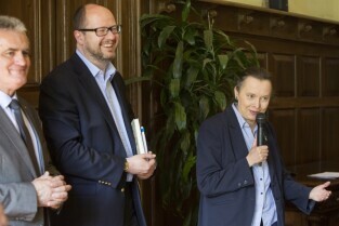 Gdańsk, Nowy Ratusz. Inauguracyjne posiedzenie Gdańskiej Rady Oświatowej kadencji na lata 2015-2018. Nz. od lewej: Przewodniczący Rady Miasta Gdańska Bogdan Oleszek, Prezydent Gdańska Paweł Adamowicz, Poseł na Sejm RP Katarzyna Hall, Z-ca Prezydenta Gdańska Piotr Kowalczuk