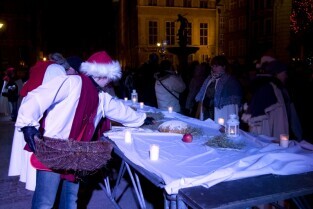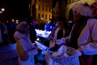 Gdańska Wigilia. Gdańsk, Długi Targ. Nz. Metropolita Gdański Abp Sławoj Leszek Głódź z wolontariuszami
