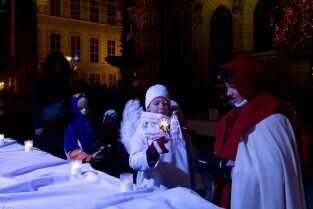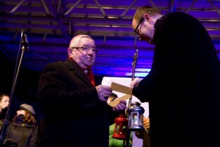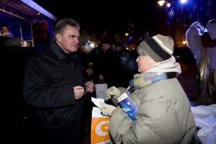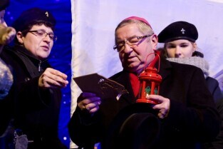 Gdańska Wigilia. Gdańsk, Długi Targ. Nz. Metropolita Gdański Abp Sławoj Leszek Głódź otrzymuje od harcerzy betlejemskie światełko