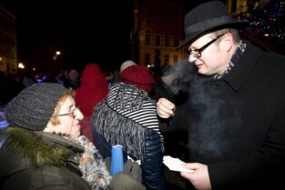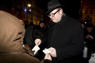 Gdańska Wigilia. Gdańsk, Długi Targ. Nz. Prezydent Gdańska Paweł Adamowicz dzieli się opłatkiem z mieszkańcami Gdańska