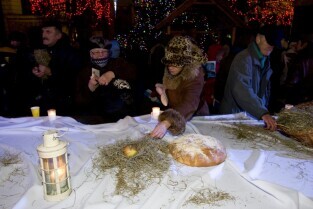 Gdańska Wigilia. Gdańsk, Długi Targ. Nz. Przewodniczący Rady Miasta Gdańska Bogdan Oleszek dzieli się opłatkiem z mieszkańcami Gdańska