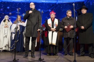 Gdańska Wigilia na Długim Targu, podczas której gdańszczanie wysłuchali życzeń i podzielili się opłatkiem. Nz. od lewej: Prezydent Gdańska Paweł Adamowicz, Metropolita Gdański Abp Sławoj Leszek Głódź, Przewodniczący Rady Miasta Gdańska Bogdan Oleszek, Radny Miasta Gdańska Grzegorz Strzelczyk