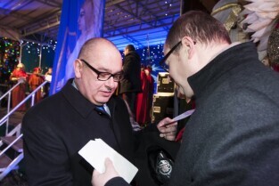 Gdańska Wigilia na Długim Targu, podczas której gdańszczanie wysłuchali życzeń i podzielili się opłatkiem. Nz. Radny Miasta Gdańska Grzegorz Strzelczyk dzieli się opłatkiem z mieszkańcami Gdańska