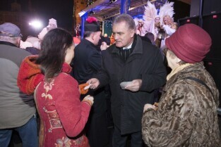 Gdańska Wigilia na Długim Targu, podczas której gdańszczanie wysłuchali życzeń i podzielili się opłatkiem. Nz. Przewodniczący Rady Miasta Gdańska Bogdan Oleszek dzieli się opłatkiem z mieszkańcami Gdańska