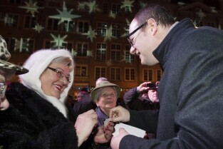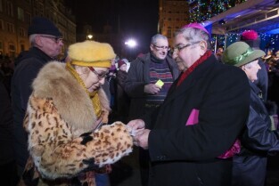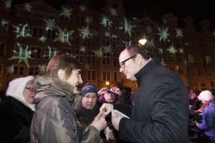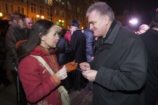 Gdańska Wigilia na Długim Targu, podczas której gdańszczanie wysłuchali życzeń i podzielili się opłatkiem. Nz. Prezydent Gdańska Paweł Adamowicz dzieli się opłatkiem z mieszkańcami Gdańska