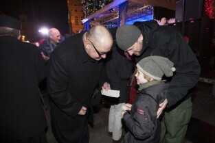Gdańska Wigilia na Długim Targu, podczas której gdańszczanie wysłuchali życzeń i podzielili się opłatkiem. Nz. Metropolita Gdański Abp Sławoj Leszek Głódź dzieli się opłatkiem z mieszkańcami Gdańska