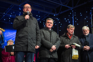 Tradycyjna coroczna Gdańska Wigilia odbyła się na Długim Targu. Nz. Prezydent Gdańska Paweł Adamowicz, Bogdan Oleszek - Przewodniczący Rady Miasta, Proboszcz Bazyliki Mariackiej Ks. Ireneusz Bradtke, Radny Marek Bumblis