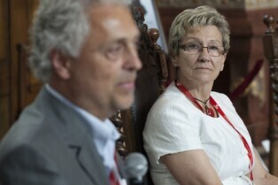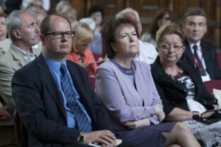 "Gdańska debata o starości" - konferencja poświęcona działaniom na rzecz seniorów oraz sytuacji demograficznej w mieście. Gdańsk, Dwór Artusa. Nz. od lewej: Prezydent Gdańska Paweł Adamowicz, Wicemarszałek Woj. Pomorskiego Hanna Zych-Cisoń, Z-ca Prezydenta Gdańska Ewa Kamińska