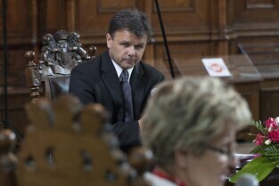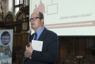 "Gdańska debata o starości" - konferencja poświęcona działaniom na rzecz seniorów oraz sytuacji demograficznej w mieście. Gdańsk, Dwór Artusa. Nz. Prezydent Gdańska Paweł Adamowicz