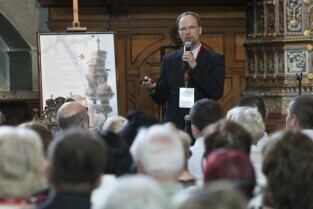 "Gdańska debata o starości" - konferencja poświęcona działaniom na rzecz seniorów oraz sytuacji demograficznej w mieście. Gdańsk, Dwór Artusa. Nz. prof. Andreas Hoff (Professor of Social Gerontology w Zittau/Gorlitz) wygłasza wykład pt. "Społeczne aspekty starzenia się ludności w Europie"
