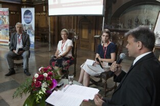 "Gdańska debata o starości" - konferencja poświęcona działaniom na rzecz seniorów oraz sytuacji demograficznej w mieście. Gdańsk, Dwór Artusa. Nz. Panel pt. "Dobre Praktyki w kontekście działań na rzecz seniorów". Nz. od lewej: Dyrektor Fundacji Regionalne Centrum Informacji i Wspomagania Organizacji Pozarządowych w Gdańsku Jerzy Boczoń, Prezes Europejskiego Stowarzyszenia Aktywności Ruchowej "50+" prof. Ewa Kozdroń, Redaktor Naczelna Magazynu Miasta Marta Żakowska, prowadzący debatę Adam Hlebowicz