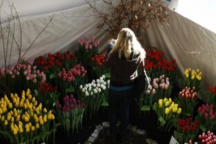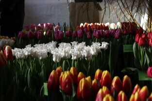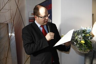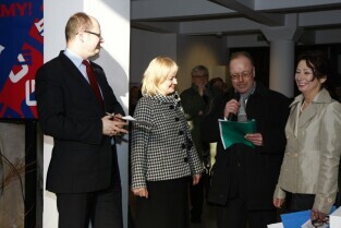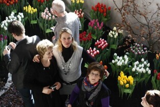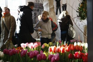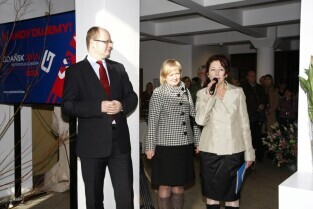 Gdańsk, kamienica przy Długim Targu. Uroczyste otwarcie wystawy "Ogród Kulturalny - Tulipany" z udziałem Prezydenta Gdańska Pawła Adamowicza i Konsula Honorowego Królestwa Niderlandów Magdaleny Pramfelt.