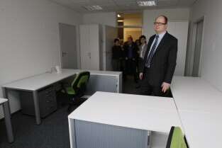 Gdańsk Przymorze. Wizyta Prezydenta Gdańska Pawła Adamowicza w ostatnio otwartym Gdańskim Inkubatorze Przedsiębiorczości.