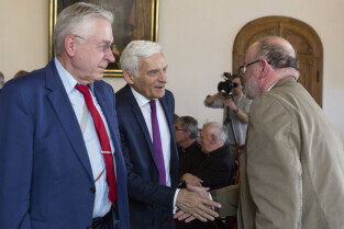 Obchody 500-lecie Reformacji. Debata w ramach Gdańskiego Kongresu Reformacyjnego. Gdańsk, Ratusz Głównego Miasta. Nz. po lewej prof. Janusz Rachoń i prof. Jerzy Buzek, po prawej pisarz Paweł Huelle