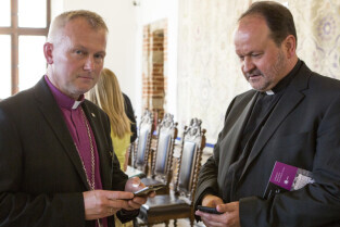 Obchody 500-lecie Reformacji. Debata w ramach Gdańskiego Kongresu Reformacyjnego. Gdańsk, Ratusz Głównego Miasta. Nz. ks. bp prof. Marcin Hintz i ks. Krzysztof Niedałtowski