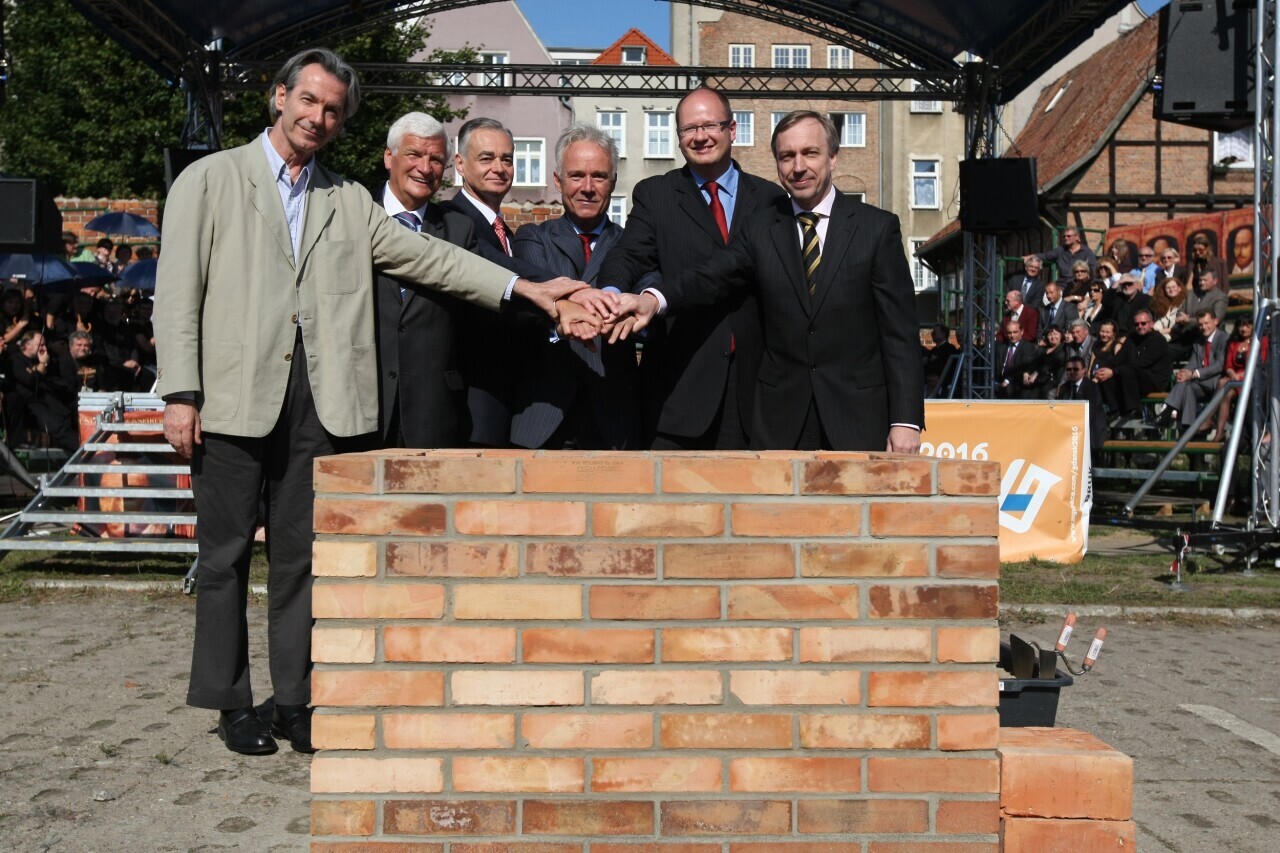 Gdańsk. Wmurowanie Kamienia Węgielnego pod Gdański Teatr Szekspirowski. Nz. od lewej: architekt Renato Rizzi - twórca projektu Teatru Szekspirowskiego, Marszałek Województwa Pomorskiego Jan Kozłowski, Dr Zbigniew Canowiecki, Dyktor Gdańskiego Teatru Szekspirowskiego prof. Jerzy Limon, Prezydent Gdańska Paweł Adamowicz, Minister Kultury i Dziedzictwa Narodowego Bogdan Zdrojewski
