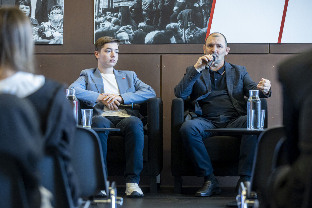Gdańsk. W Europejskim Centrum Solidarności trwa Gdański Tydzień Demokracji. Nz. Spotkanie z Ines, Andrzejem i Marcinem Pisalnik z Białorusi