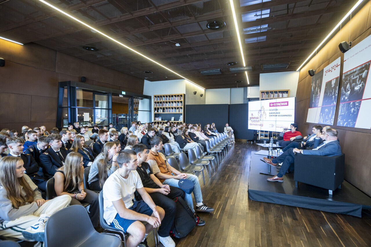 Gdańsk. W Europejskim Centrum Solidarności trwa Gdański Tydzień Demokracji. Nz. Spotkanie z Ines, Andrzejem i Marcinem Pisalnik z Białorusi