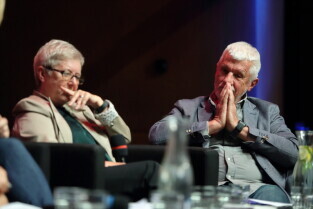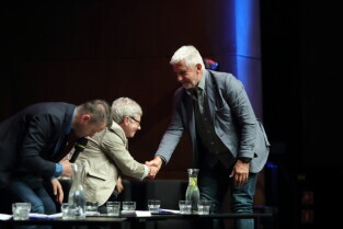 Gdańsk. Europejskie Centrum Solidarności. Gdański Tydzień Demokracji. Pierwsza debata "Dokąd zmierzamy?" Nz. Praf. Jerzy Bralczyk i Wiceprezydent Gdańska Piotr Grzelak.