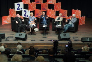 Gdańsk. Europejskie Centrum Solidarności. Gdański Tydzień Demokracji. Pierwsza debata "Dokąd zmierzamy?" Nz. Jerzy Bralczyk, Lena Kolarska-Bobińska, Jarosław Kuźniar, Mirosława Marody i Wojciech Eichelberger.