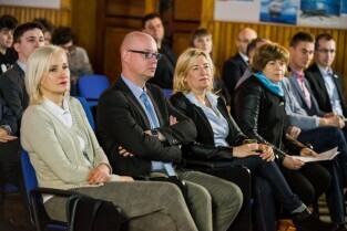 Gdańsk, ul. Piramowicza. Gdański tydzień zawodowca. CONRADINUM. Konferencja dla gimnazjalistów "Przemysł okrętowy - fascynujące miejsce pracy". Nz Katarzyna Chęsy, Grzegorz Kryger, zastępca dyrektora ds. edukacji w Urzędzie Miejskim w Gdańsku i pani Krystyna Jacobsen z Biura Forum Okrętowego