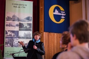 Gdańsk, ul. Piramowicza. Gdański tydzień zawodowca. CONRADINUM. Konferencja dla gimnazjalistów "Przemysł okrętowy - fascynujące miejsce pracy". Nz Anna Wasilewska, dyrektor szkoły.
