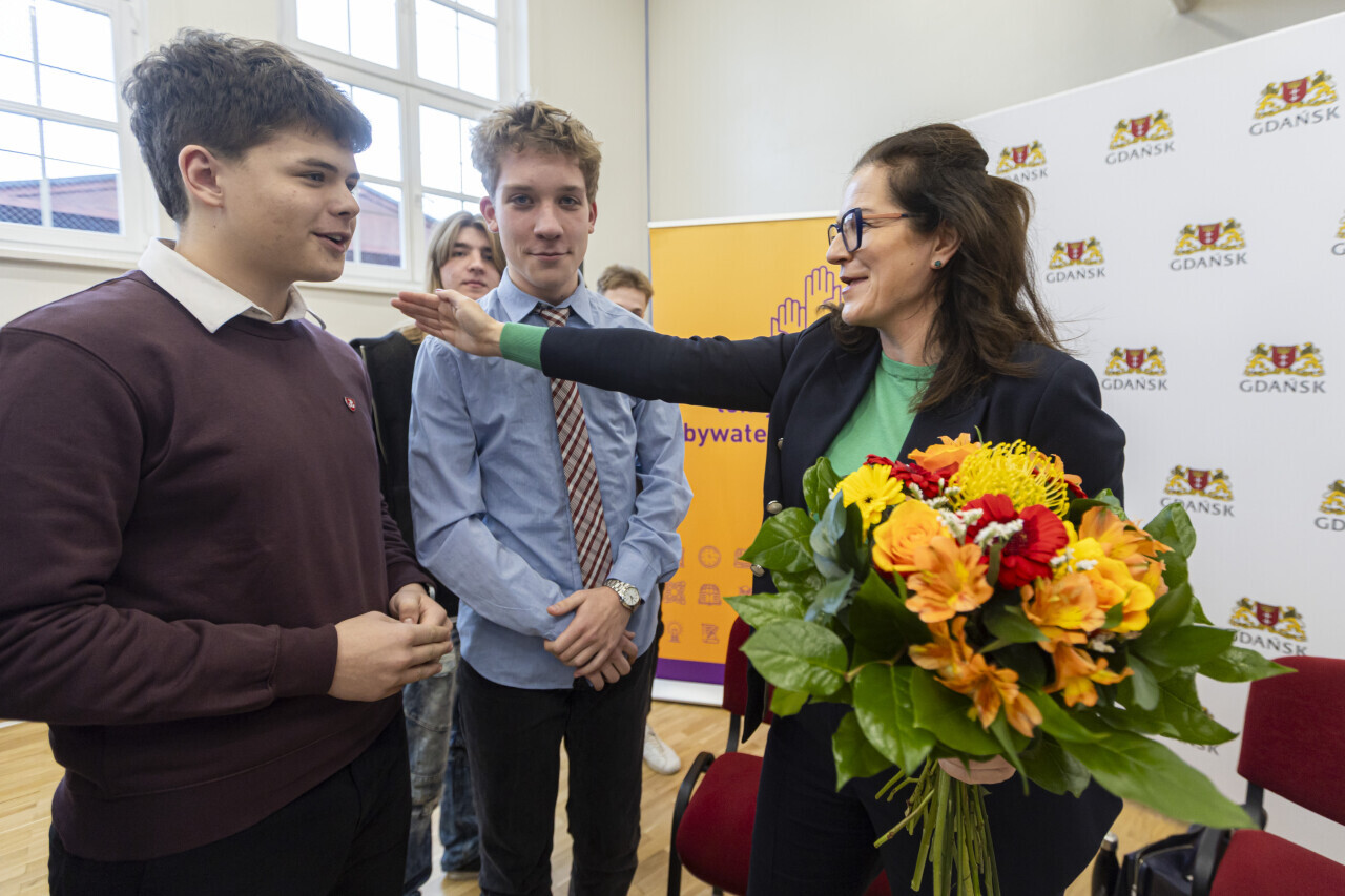 Gdańsk. W ramach Gdańskich Lekcji Obywatelskich Prezydent Aleksandra Dulkiewicz odwiedziła uczniów IX Liceum Ogólnokształcącego im. Krzysztofa Kolbergera.