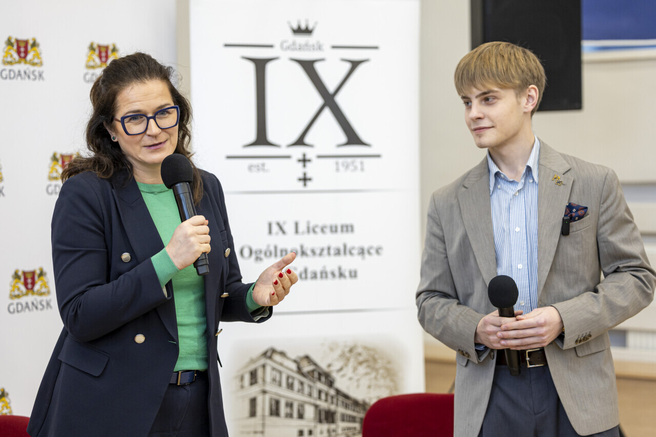 Gdańsk. W ramach Gdańskich Lekcji Obywatelskich Prezydent Aleksandra Dulkiewicz odwiedziła uczniów IX Liceum Ogólnokształcącego im. Krzysztofa Kolbergera.