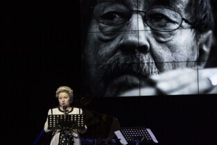Kościół Św. Jana w Gdańsku. Uroczystość pożegnania zmarłego pisarza, grafika i rzeźbiarza Güntera Grassa. Nz. aktorzy Dorota Androsz i Piotr Witkowski czytają fragmenty dzieł pisarza