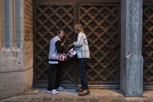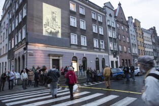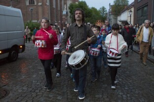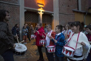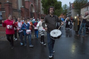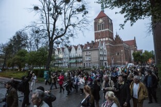 Uroczystość pożegnania zmarłego pisarza, grafika i rzeźbiarza Güntera Grassa. Przemarsz przy dźwiękach blaszanych bębenków spod Kościoła św. Jana do Gdańskiej Galerii Güntera Grassa przy ul. Szerokiej