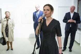 Uroczystość pożegnania zmarłego pisarza, grafika i rzeźbiarza Güntera Grassa. Wystawa "Günter Grass – kolekcja gdańska”, Gdańska Galeria Güntera Grassa (ul. Szeroka). Nz. Dyrektor GGGG Iwona Bigos