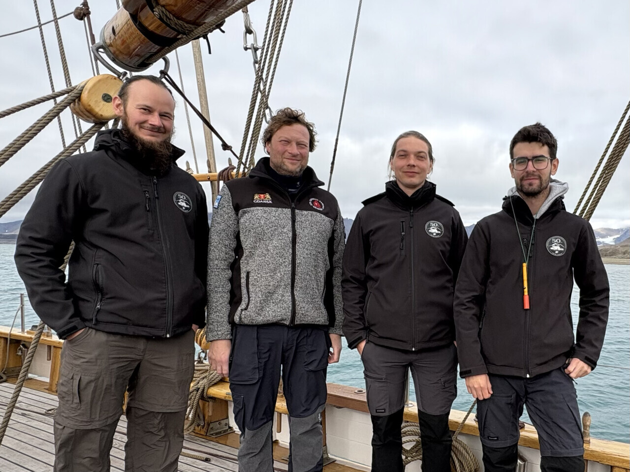 Załoga Stacji UMK Kaffiøyra. Od lewej Kamil Czarnecki, Marcin Dobrowolski - kapitan statku, Przemysław Sala i Bartłomiej Cerski wyprawa Generała Zaruskiego na Spitsbergen