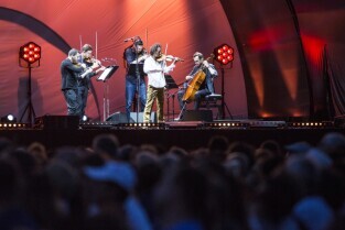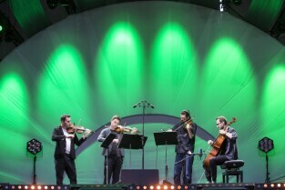 Widowisko muzyczne "Górecki+" w ramach festiwalu Solidarity of Arts. Gdańsk Ołowianka, scena plenerowa Filharmonii Bałtyckiej. Nz. Atom String Quartet