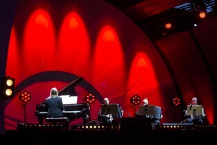 Widowisko muzyczne "Górecki+" w ramach festiwalu Solidarity of Arts. Gdańsk Ołowianka, scena plenerowa Filharmonii Bałtyckiej. Nz. Leszek Możdżer & Motion Trio