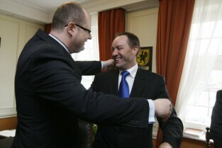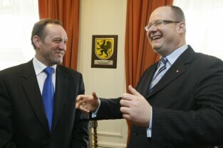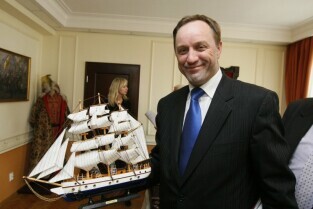 Prezydent Gdańska Paweł Adamowicz gratuluje Mieczysłowi Strukowi powołania na nowego Marszałka Województwa Pomorskiego. W prezencie przekazał mu model statku Cutty Sark.