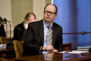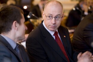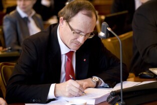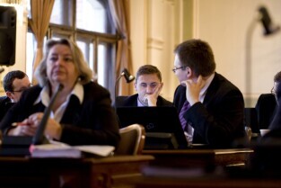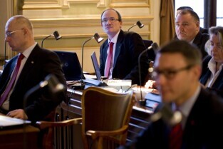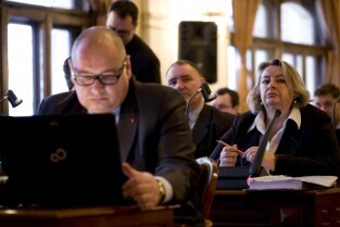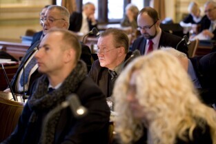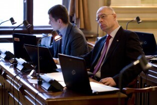 Grudniowa sesja Rady Miasta Gdańska w Nowym Ratuszu. Nz. radny Kaziemierz Koralewski, po lewej Jaromir Falandysz