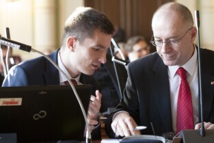 Gdańsk, Nowy Ratusz. Grudniowa sesja Rady Miasta Gdańska, podczas której m.in. uchwalony został budżet miasta w 2014 r. Nz. od lewej: Radny Miasta Gdańska Pitor Gierszewski i Wiceprzewodniczący Rady Jacek Teodorczyk